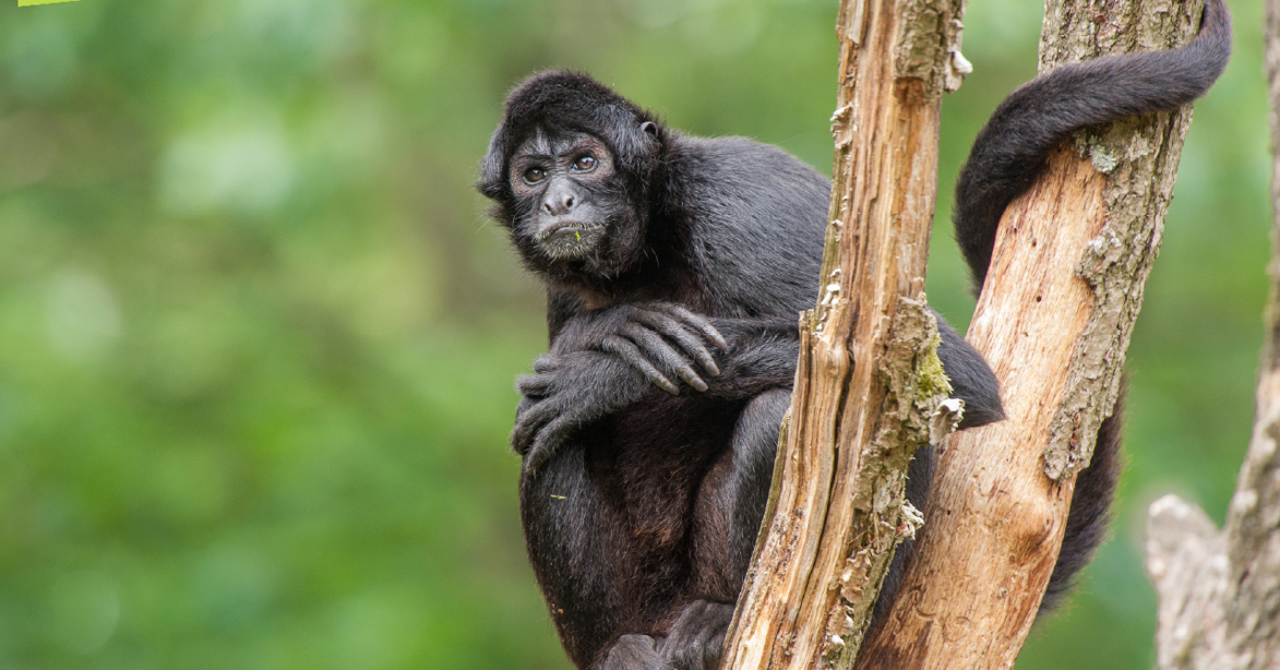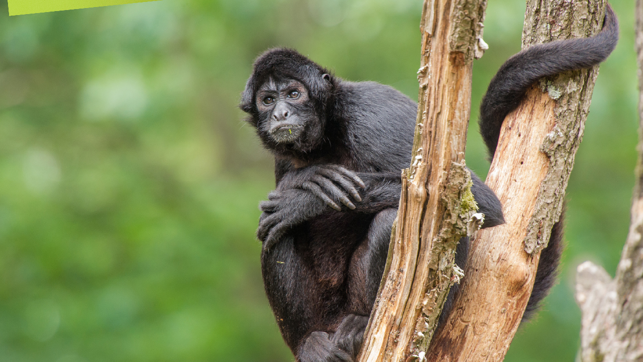 Brown-headed spider monkeys have black fur. Their faces are pink-ish and they have white hairs on their chin. The males are slightly larger than the females. They have a thin body with long, slim arms and legs. Males have an olfactory gland on their chest with which they can deposit scents. Brown-headed spider monkeys’ tails are really prehensile. Their tails are actually like a fifth hand which they use to hold themselves up and to grasp things. Their tails can even support their entire body weight. A striking detail on female brown-headed spider monkeys is the pink ‘appendage’ on their behind. This is their clitoris.