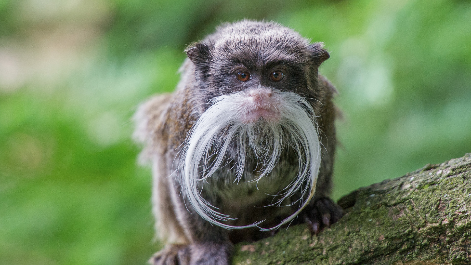 Emperor tamarins are dwarf monkeys. You can recognise them right away by their characteristic white moustaches. Males, females and young all have them. The emperor tamarin’s fur is mottled grey-brown. They also have a brown-orange tail. And just like other dwarf monkeys, they have claws. These enable them to hold on tightly to trees and branches, even vertically. Emperor tamarins also have olfactory glands on their chest and genitals.