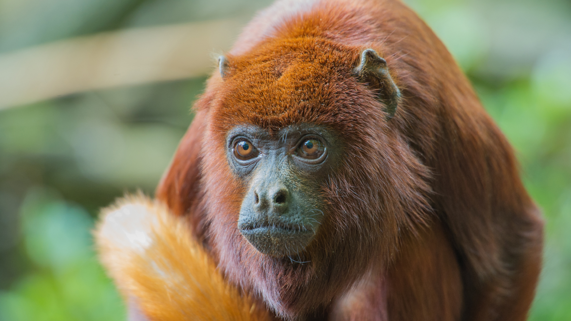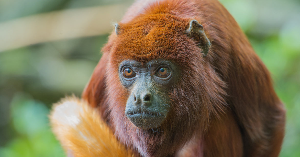 Like their name states, Colombian red howlers have a stunning red fur. However, their face appears completely different: hairless and black. Colombian red howlers also have a beard. The males’ beard is a bit darker than the female one. Colombian red howlers also have a prehensile tail, with which they can grasp on to their surroundings firmly and easily. The very lowest tip of this tail is hairless, which provides extra grip. So it’s kind of like a fifth hand (or feet)! And obviously, like their names says, these primates are known for their loud howling. This is how they signal their territory to other animals.