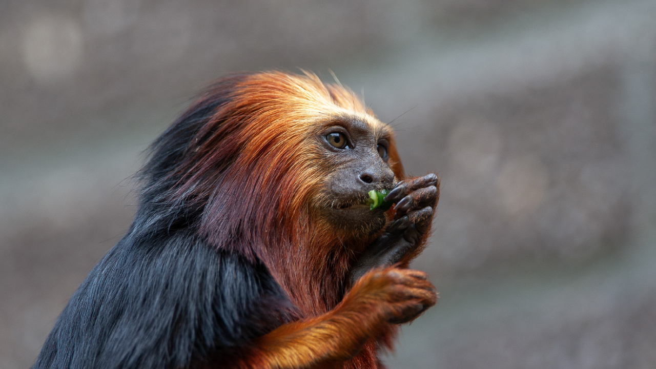 The name gives you a clue: golden-headed lion tamarins have beautiful orange fur around their head and shoulders. It looks a bit like a lion’s mane. Their bodies are covered in black fur but their limbs are golden-coloured. They have claws instead of the flat nails most other primates have. This gives them a good grip on trees and branches when they climb. For this reason, golden-headed lion tamarins are also known as clawed monkeys. Golden-headed lion tamarins have olfactory glands on their chest and behind. They use these to let other animals know things like their location, what sex they are and whether they are ready to mate.