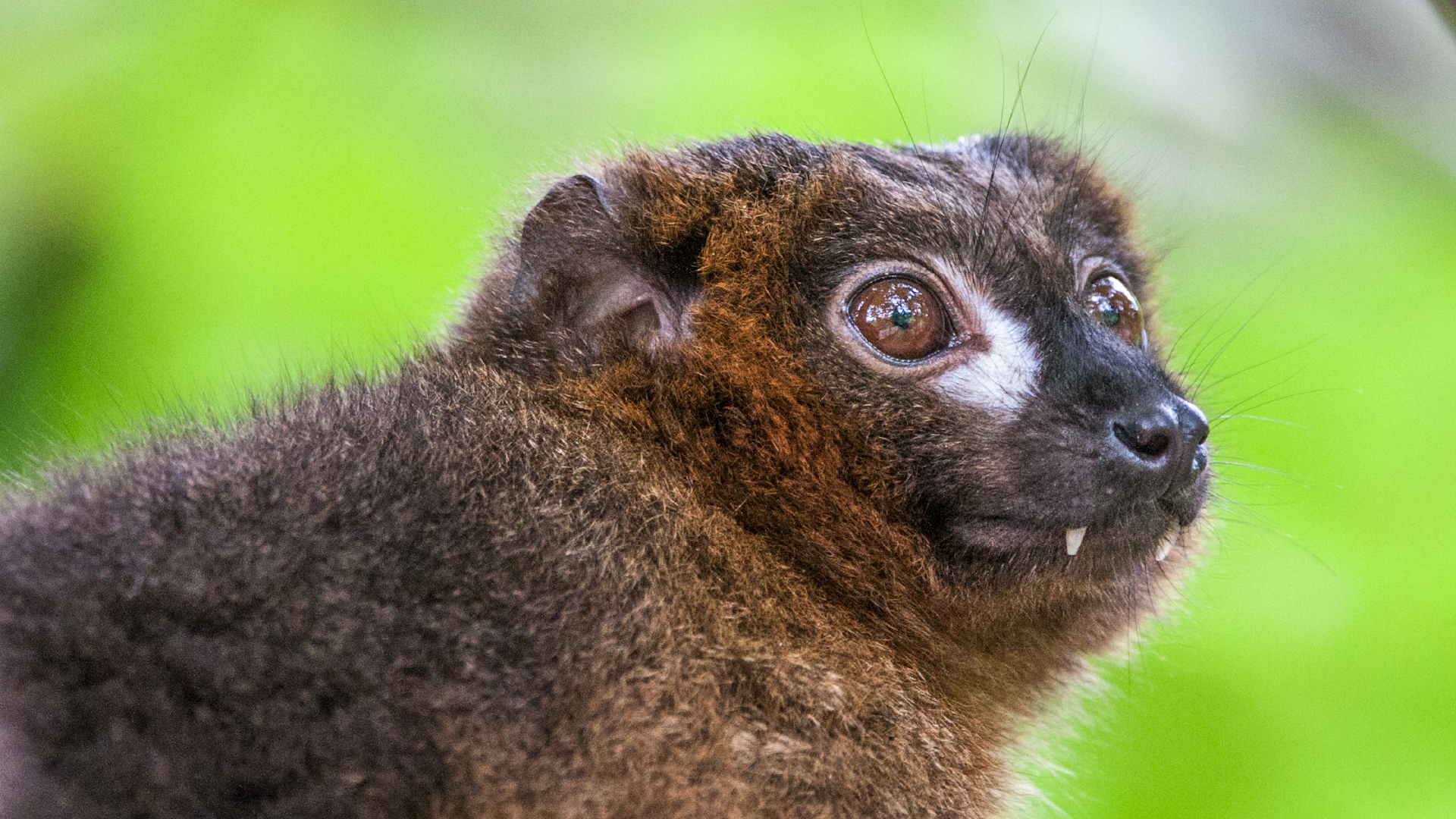 Red-bellied lemurs thank their name to the appearance of the adult males. In fact, only the males have a red belly. For the rest red-bellied lemurs have a thick, reddish-brown fur. Their tail is coloured black. You can recognize the males based on two things: they have white spots around their eyes and a greasy spot on the top of their heads. That’s a scent gland with which they mark their surroundings with scents, looking kind of similar to a gelled hairstyle. Furthermore, all red-bellied lemurs carry these scent glands around their anus. Red-bellied lemurs classify as half-apes. So they have quite a long and pointy nose, with eyes that look straight forward.